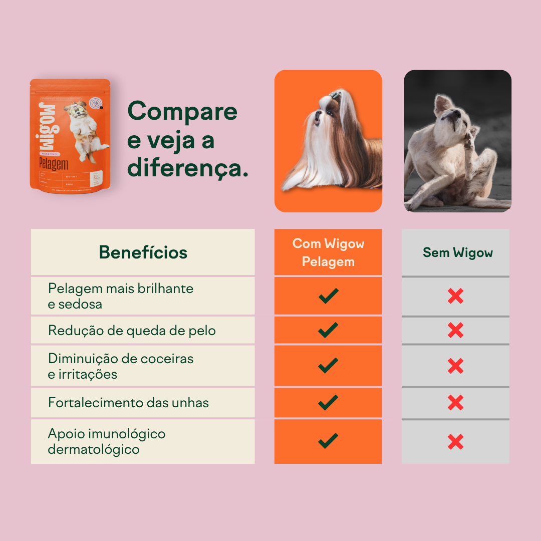 Essa é uma preocupação super válida, e foi justamente pensando em cães com sensibilidades que pensamos, não só o suplemento Wigow Pelagem, mas toda a nossa linha. Utilizamos a base de proteína de salmão, indicada para cães com sensibilidade às proteínas mais comuns. A fórmula é livre de ingredientes comuns em reações alérgicas e atua como um suporte para cães com sensibilidades dermatológicas. Em vez de causar alergias, o suplemento contribui para equilibrar e proteger a pele de dentro para fora, com resultados visíveis no brilho e na saúde da pelagem.
